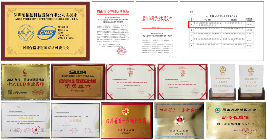 2022年,萊福德榮獲政府/行業/協會認可榮譽18項。如標志深圳實驗室正式躋身國家認可實驗室行列的CNAS認可證書、眉山市工程技術研究中心、政府質量獎、智能制造試點示范單位等