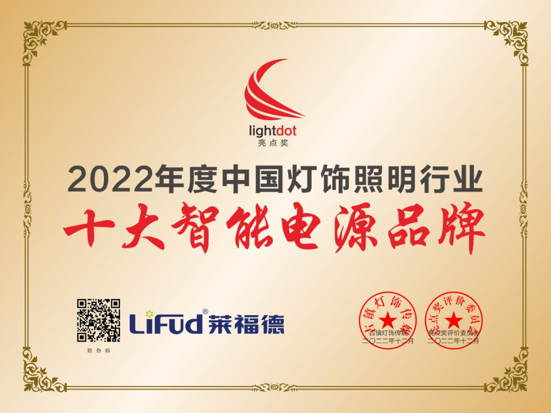 在萊福德全心全意為客戶服務,打造智能產品市場的同時,行業也對萊福德智能產品、品牌有了更深的認可。在客戶朋友的支持下,萊福德榮獲中國燈飾照明行業2022年度十大智能電源品牌!