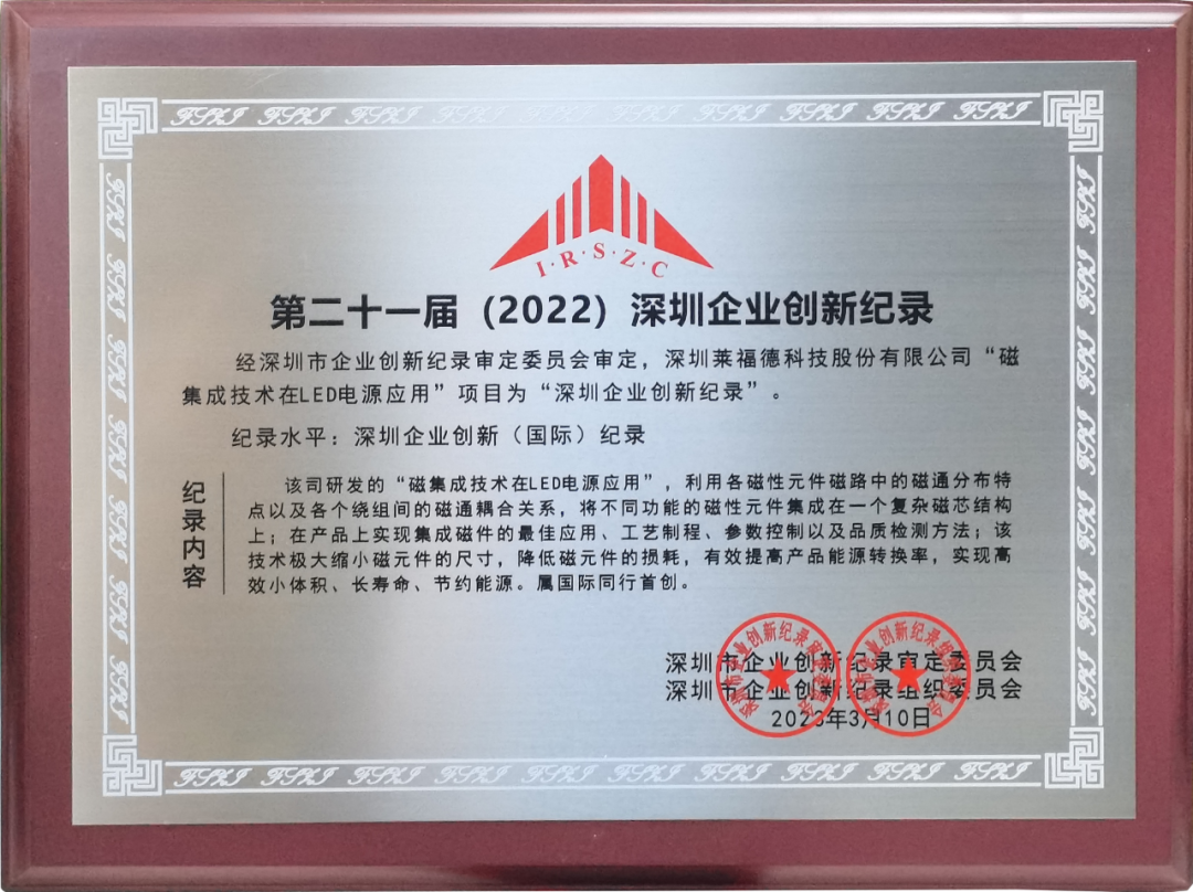 萊福德“磁集成技術在 LED 電源應用”項目在榮獲過國家/省/市科技進步獎、打破壟斷填補國內技術空白的眾多項目中脫穎出,成為本屆深圳企業創新紀錄之一。