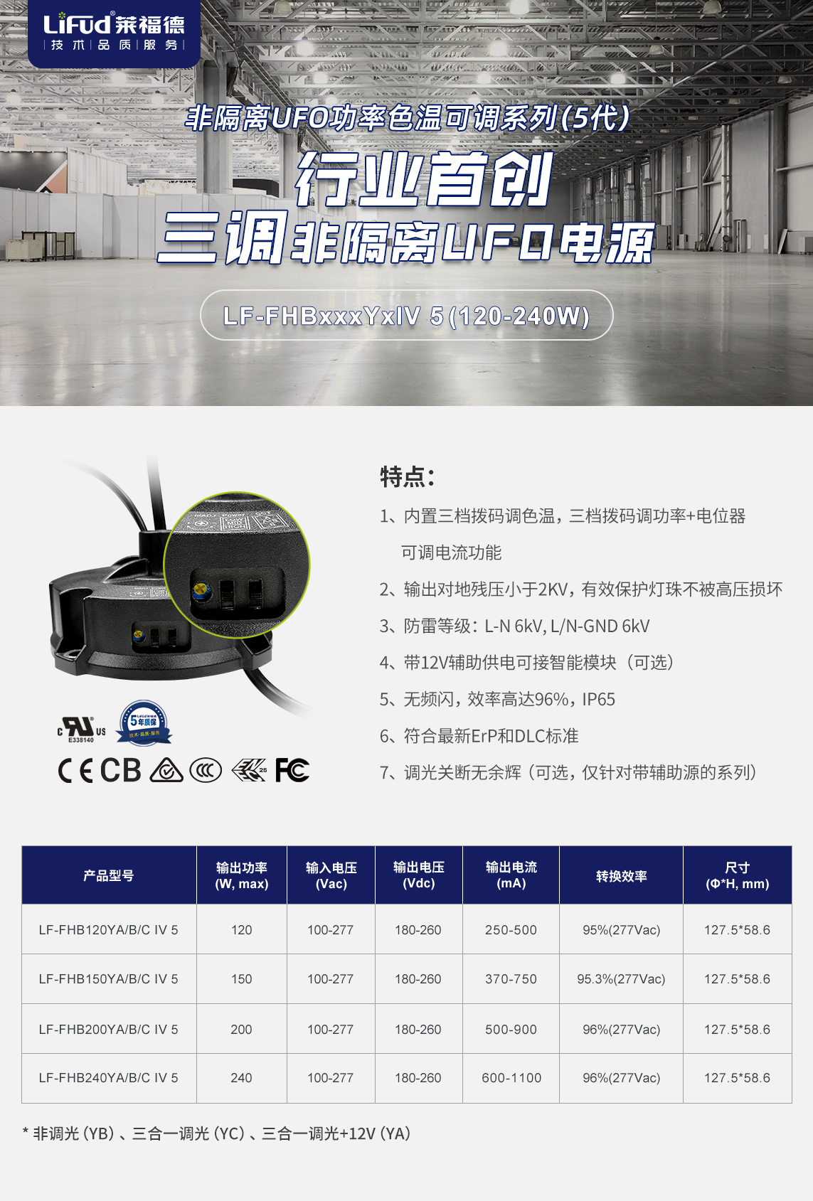 LF-FHBxxxYx IV 5系列是萊福德第五代非隔離UFO電源,首次集成了功率、色溫、電流撥碼,實現三調功能,在面對終端差異化且小型化的項目時,可快速通過撥碼調整整燈效果,有效減少客戶燈具SKU,降低備貨成本,并快速響應項目交期需求!