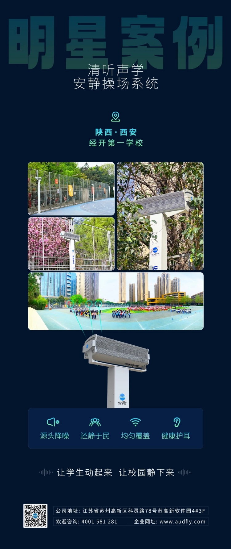 為了解決操場噪聲難題,西安經開第一學校引進了清聽聲學安靜操場系統(校園定向廣播系統)。
