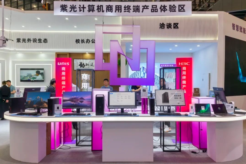 在紫光計算機展位,重點展示了搭載全新英特爾®酷睿™桌面處理器(第14代)的商用臺式機UltiDesk 500 G2系列;擁有雙NVMe M.2 SSD接口+雙DDR5內存插槽的商用輕薄筆記本UItiBook Pro 14 G2;采用國產化處理器的商用臺式機UNIS D3890 G2(兆芯KX-U6780A八核處理器)、UNIS D3830 G3(海光3350八核處理器)、UNIS D3811 G2(飛騰D2000八核處理器)、商用筆記本UNIS L3891 G3(兆芯KX-6000G四核處理器)、UNIS L3813 G2(飛騰D2000八核處理器)。此外,新一代商用顯示器、桌面生態配件及相關配套產品也悉數展出。