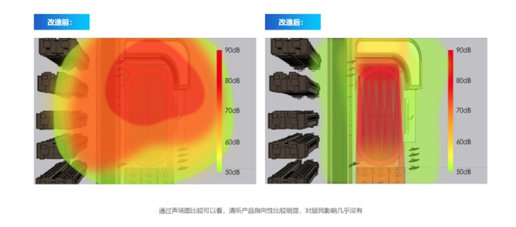 通過改造前后的聲場示意圖可以對比看到,改造后的聲場顯示出的紅色面積明顯比改造前縮小,聲場集中覆蓋在操場內,噪聲對周邊的波及范圍大幅降低。周邊的居民也表示:“以前學校課間操、體育課、運動會的時候,(聲音)特別吵鬧,我都會立馬關窗戶,現在感覺聲音降低了很多,就算在家開窗戶,也比以前聲音小多了!