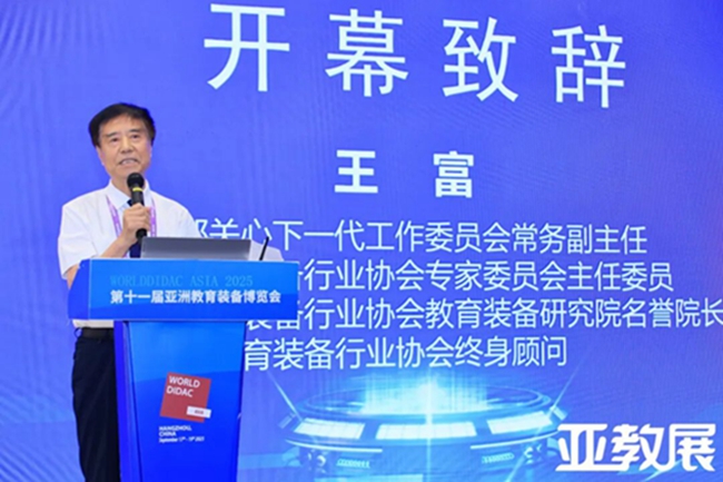 教育部關心下一代工作委員會常務副主任、中國教育裝備行業(yè)協會專家委員會主任王富應邀出席會議并致辭。他對溫州教育裝備產業(yè)的發(fā)展成就以及《溫州市“人工智能+教育”三年行動計劃》的發(fā)布予以充分肯定,并提出智能教育裝備應推進跨界融合、資源整合、行業(yè)聯合與專精結合,構建“四橫五縱”的資源布局與AI賦能體系。其中,“四橫”涵蓋基礎教育、高等教育、職業(yè)教育和終身教育;“五縱”則對應德育、智育、體育、美育和勞動教育,體現“五育并舉”的育人理念。