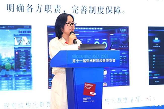 甌海區(qū)教育技術中心副主任黃菊敏則從甌海區(qū)域實踐角度,分享人工智能如何賦能區(qū)域智慧教育生態(tài)重構。她以雙向適配為主題,從“基座與賦能”“應用與場景”“治理與躍升”三個層面介紹了甌海區(qū)構建“甌教云”智能平臺與高質量數據體系、推進人工智能與教育教學深度融合、打造數智驅動的區(qū)域教育智治生態(tài)的探索,呈現了區(qū)域整體推進智慧教育建設的“溫州樣本”。