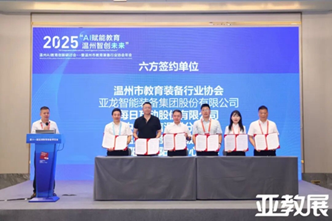 會議期間,通過“政-產-學-研-用”各方的深度對話,我們凝聚了“共創(chuàng)共贏”的廣泛共識,成功促成溫州市教育裝備行業(yè)協會、亞龍智能裝備集團股份有限公司、中國電信股份有限公司溫州分公司、每日互動股份有限公司、溫州市第八高級中學及平陽縣昆陽第二小學共同簽署六方《2025溫州AI教育創(chuàng)新戰(zhàn)略合作協議》。