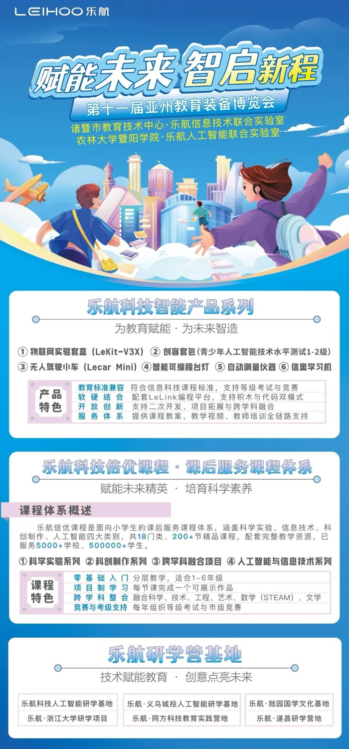 教育裝備是連接教育理念與實(shí)踐的橋梁,是激發(fā)學(xué)生創(chuàng)新思維的重要載體。在第十一屆亞洲教育裝備博覽會上,樂航科技將用專業(yè)的產(chǎn)品、創(chuàng)新的理念、豐富的實(shí)踐經(jīng)驗(yàn),與您共同探討教育裝備的未來發(fā)展方向。