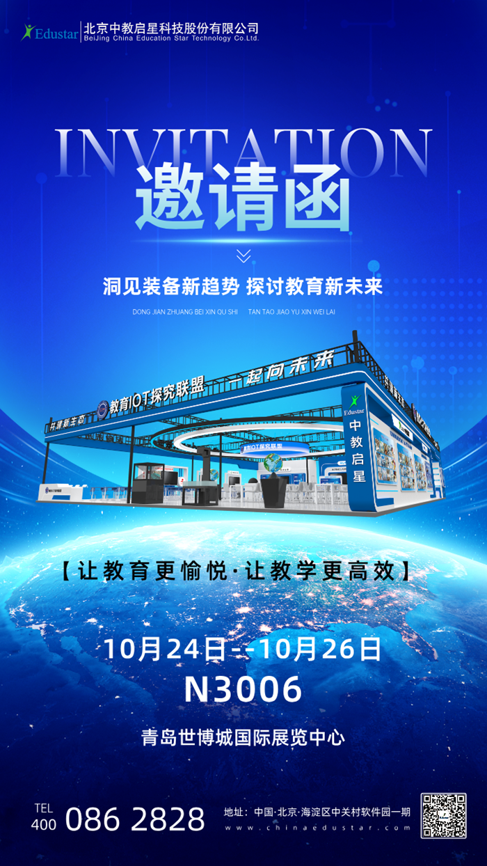 感謝您長期以來對中教啟星的信任與支持!第86屆中國教育裝備展示會開展在即,我們誠摯邀請您于10月24日-26日蒞臨青島世博城國際展覽中心N3006展位,期待與您相聚魅力青島,與我們共話未來、共謀發(fā)展。