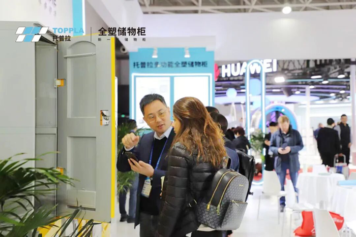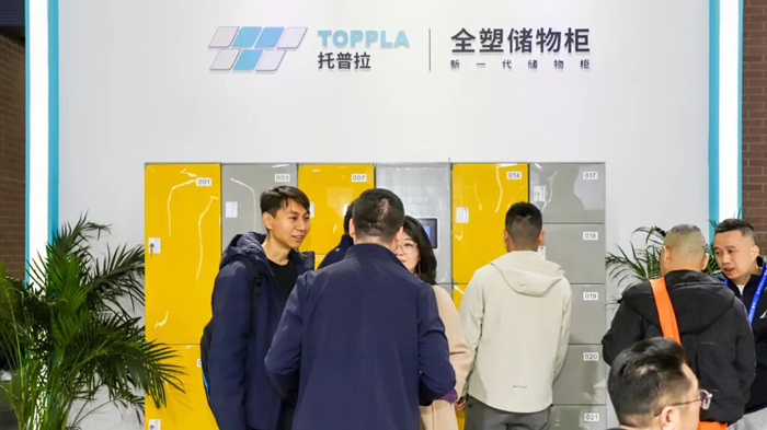 托普拉展位以創新設計打破傳統陳列模式,打造了教室、辦公室、宿舍等多元場景下的全塑儲物柜一體化解決方案。