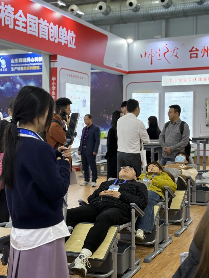 此次展會,師生之友向大家展示了符合國家標準GB/T46016-2025的優質午休課桌椅,尤其是本次展會新品側躺式午休課桌椅受到了眾多師生朋友們的一致好評,小學排距90cm,中學排距100cm就能實現后仰150度午休。課椅座面采用特制的PE藤制材料編織,透氣性好,還具備良好的承托彈性,久坐不易疲勞,提升睡眠質量。工作人員以專業的技術講解以及現場功能展示,向各位參展商展示了產品的亮點。