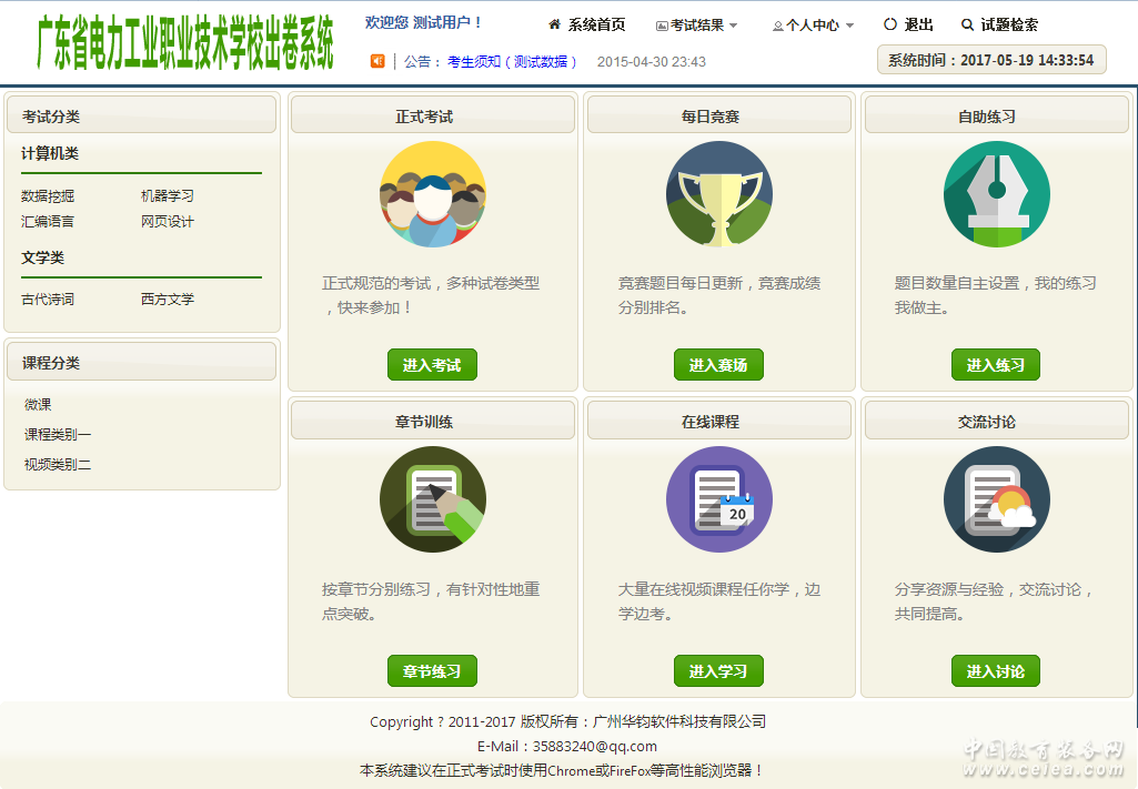 產品詳細介紹 在題型方面,內置單選題、多選題、填空題、判斷題、問答題、文件題、綜 合題七種基本題型,可以變通設置出案例分析、完型填空、閱讀理解、聽力、視 頻、仿真、做圖等世面上所見的絕大多數題型。 在試卷方面,支持簡單隨機試卷、人工試卷、隨機試卷三種試卷,簡單隨機 試卷能夠快速組卷,人工及隨機試卷內部支持自定義大題,自定義小題分值。 在考試應用方面,本系統支持綜合考試、每日競賽、自助練習、章節練習、 錯題練習 5 種考試。 系統的其它功能涵蓋了多級試題模塊管理、題庫導入導出、公式編輯、音頻 播放、視頻播放、本地圖片自動上傳、成績管理、考試中斷恢復、多級部門管理、 考場管理、用戶管理、信息發布與討論區管理、管理員操作日志管理、用戶個人 文件管理等絕大多數在線考試管理功能?荚嚰瓤梢葬槍λ杏脩粢部梢葬槍Σ 門用戶;考試評分可以分為智能評分與人工評分兩種;選擇題的選項既可隨機也 可以不隨機;既可以設置為允許用戶重復考試也可以為不允許用戶重復;前臺用 戶可以直接參加考試,根據后臺設置自動生成試卷,考試頁面倒計時,時間到自 動提交試卷,前臺用戶還可以查詢考試成績、成績的題型分值及得分分布圖、試 卷的詳細得分情況及試題解析;考試完成后可以在“錯題中心”單獨繼續練習做 錯的題,管理員還可以發布各類公告信息或設置討論區,公告信息中可方便地發 布文件和視頻,可由用戶回復與討論,也可以直接通過討論區組織小型培訓。系 統還內置了第三方平臺接口,可以無縫與其它平臺對接,實現單點登錄與協同管 理。本系統可以運用于各類考試領域,適用性、擴展性、穩定性良好。 |