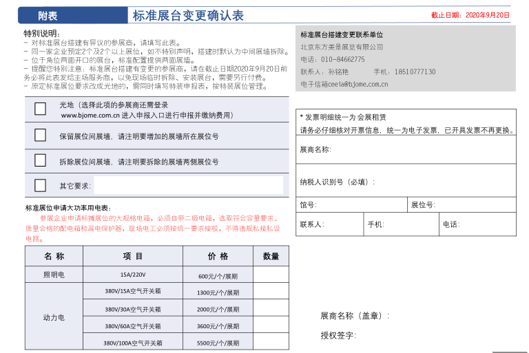 -請參展商通知各自的搭建單位務必于2020年9月20日17:00前與北京東方美景展覽有限公司聯(lián)系辦理施工申請手續(xù),交納相關費用。逾期未辦理申報手續(xù),將產生滯納費用,詳見各附表。